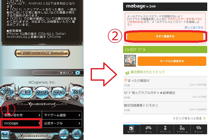 mobageアカウントの登録は、グラブルのトップページから、